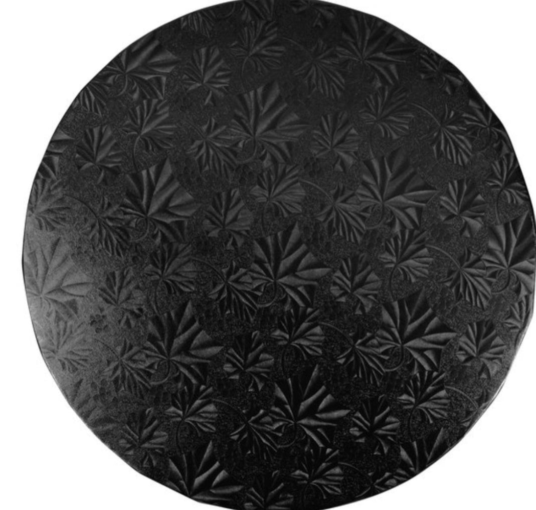 Provide a stable foundation for your cake and easily insert it in a box with this Enjay 1/2-10RB12 10" fold-under 1/2" thick round black cake drum. This durable circle supports and carries even the heaviest cakes. Plus, its top features a clean, black coloring that ensures your vibrant, colorful icings and intricate designs stand out for a stunning appearance. Add this cake drum to your bakery, grocery store, or market for quality cake support!