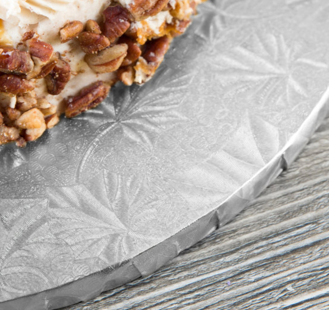 This cake drum is designed specifically for use beneath cakes being transported or displayed. This cake drum works well with 10" round cakes in particular and has a fold-under feature, adding to the sleek design. It boasts a foil top to resist grease and stop it from seeping into the cardboard, and the foil is also embossed for an attractive design. So there is no need to modify your moist cake recipe or refrain from using your signature sweet buttercream icing; this greaseproof drum can handle it!