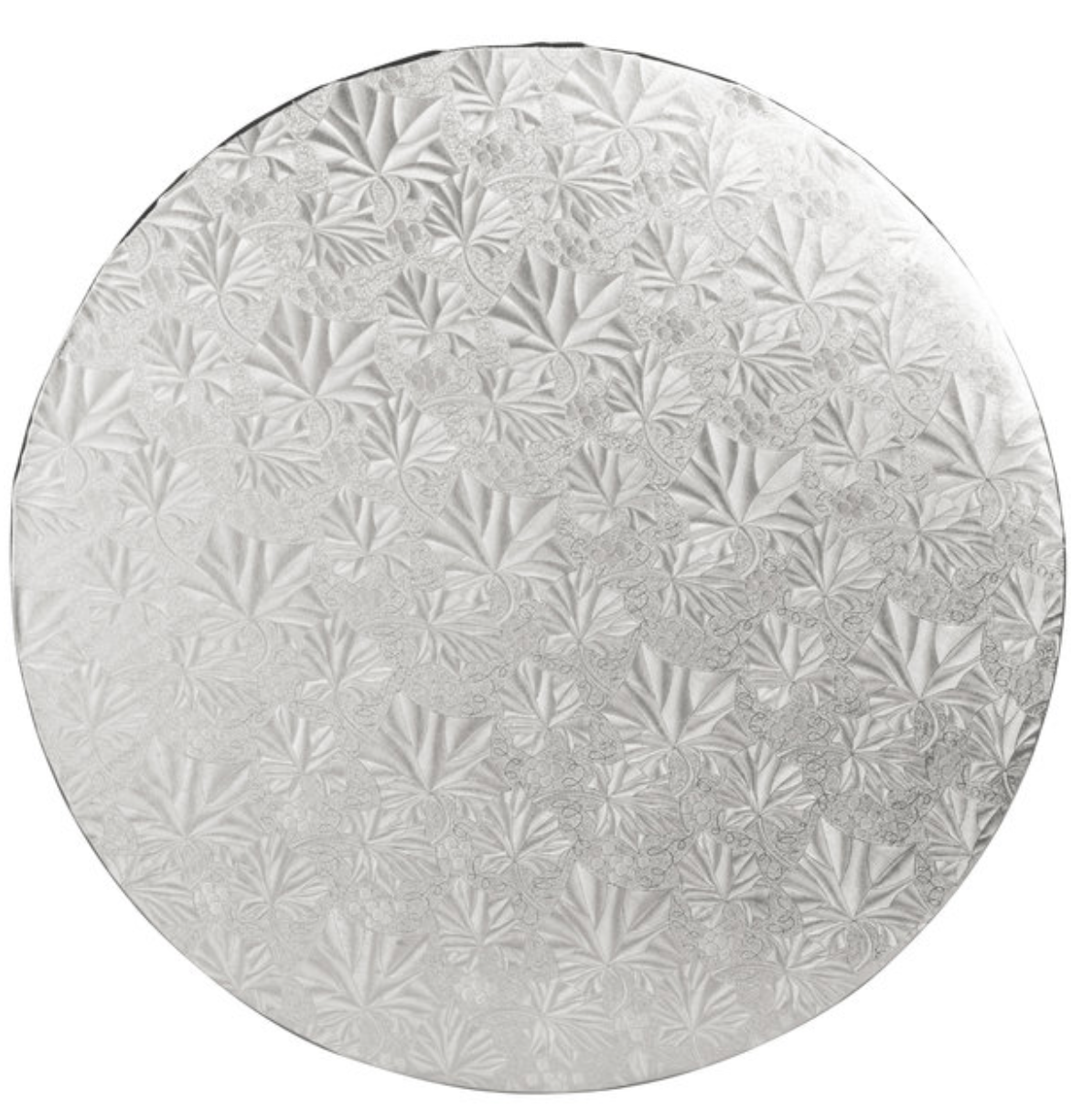 This cake drum is designed specifically for use beneath cakes being transported or displayed. This product works well with 14" round cakes in particular and has a fold-under feature, adding to the sleek design. It boasts a foil top to resist grease and stop it from seeping into the cardboard, and the foil is also embossed for an attractive design. So no need to modify your moist cake recipe or refrain from using your signature sweet buttercream icing; this greaseproof drum can handle it!