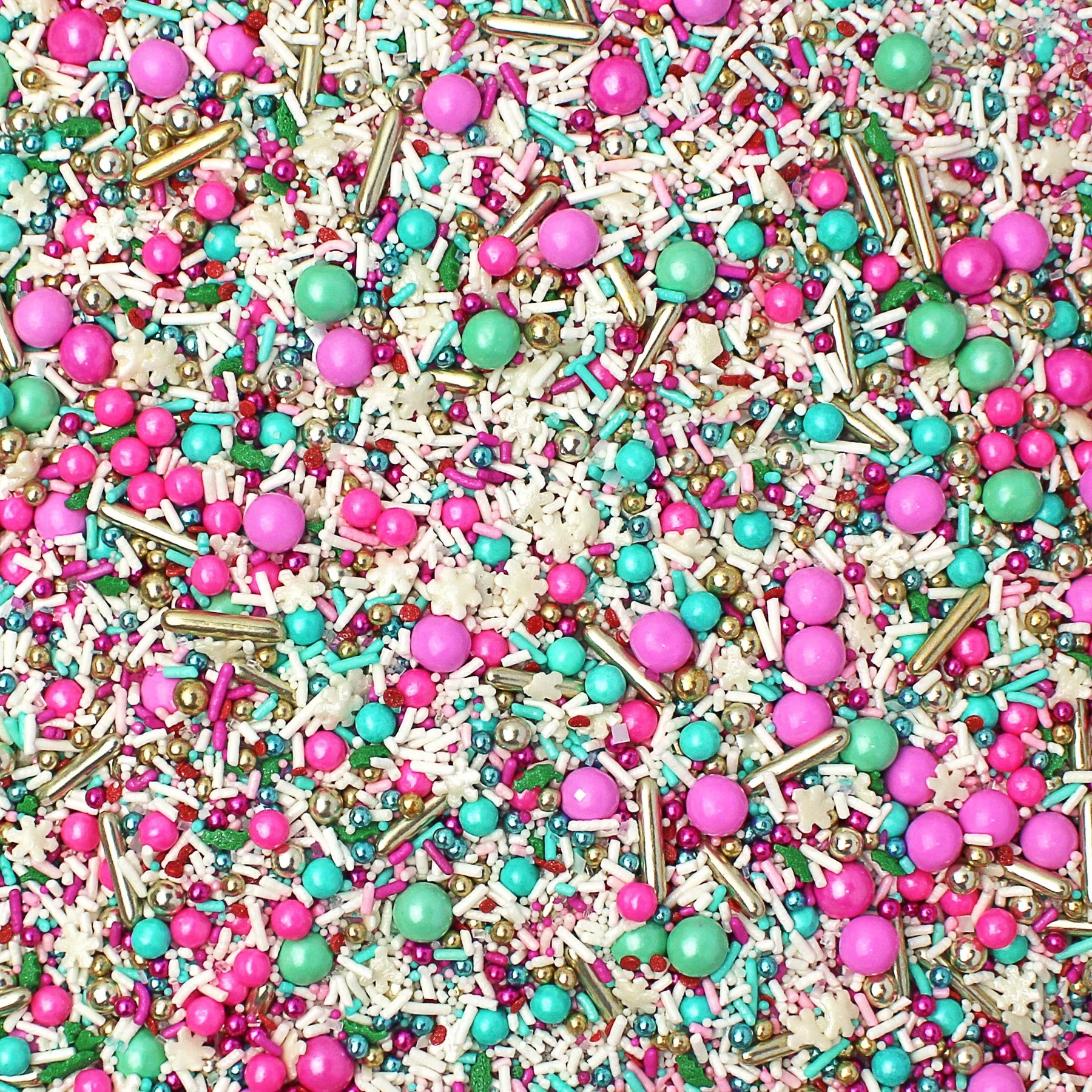 This fun and festive sprinkle mix and sure to add a boost of color to your holiday treats. Pinks and turquoise pop against shimmery white sprinkles and snowflakes. A sprinkle of red and green holly confetti and vintage gold dragees give this mix a signature Sprinkle Pop Christmas vibe.
