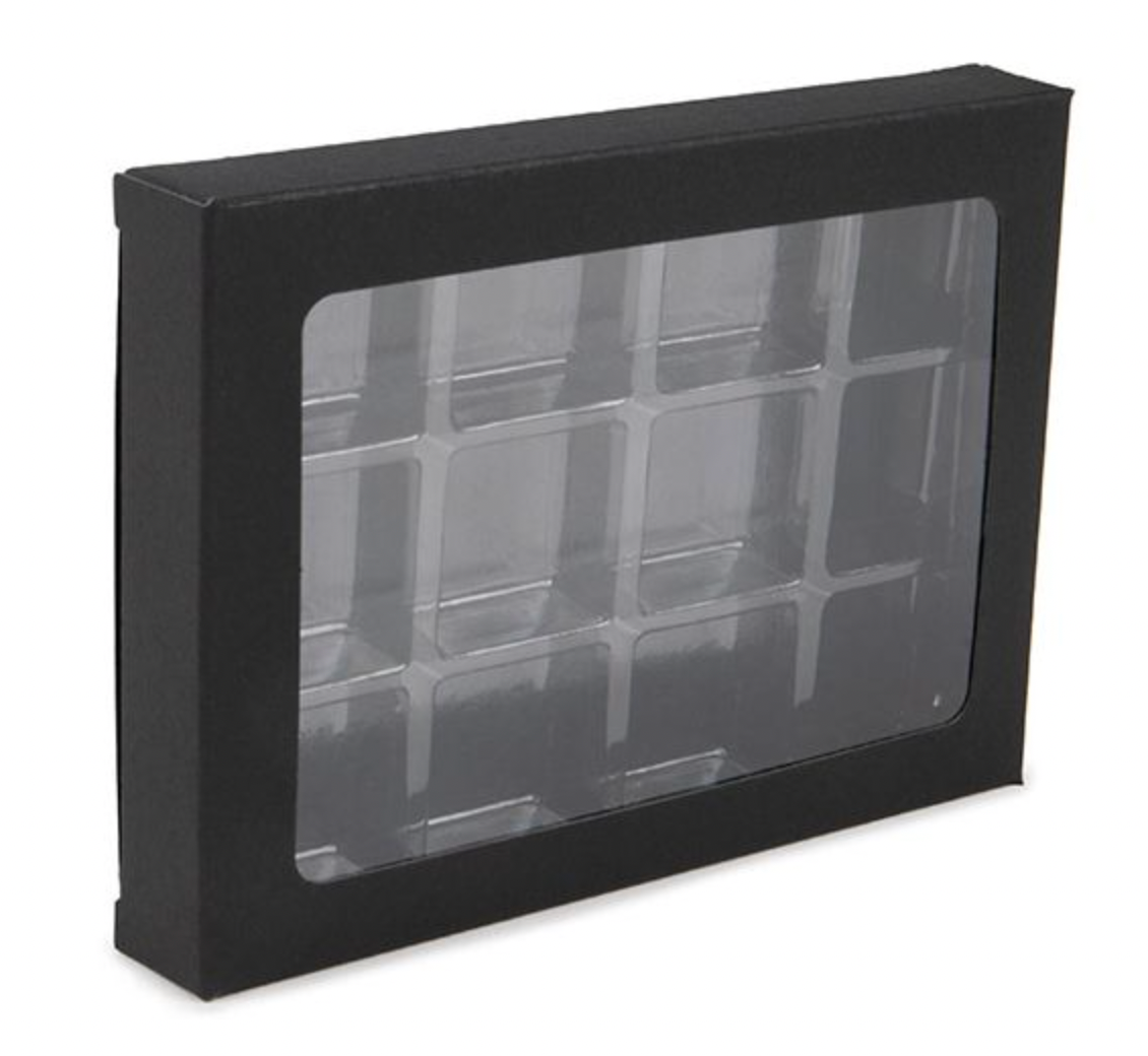 The outer box is made from food safe kraft black material and measures 4" x 13/16" x 5 7/16" with a PET attached window. The inner thermoform tray comes with 12 cavities measuring 1" x 7/16" x 1" and can withstand temperatures up to 149 degrees Fahrenheit.