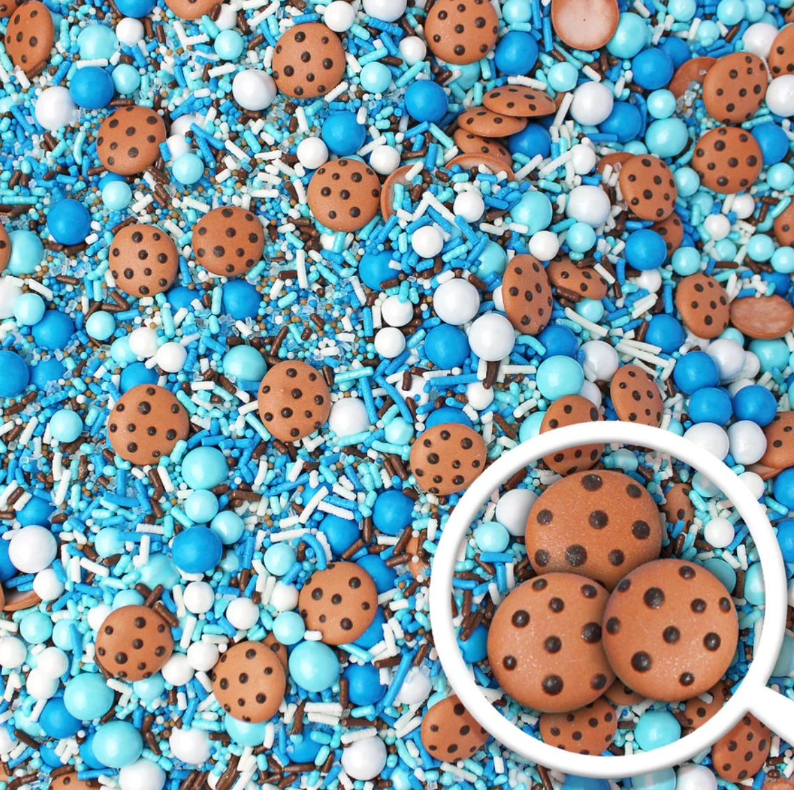 Our Cookies and Milk Sprinkle Mix is a sweet blend of blues and whites with pops of chocolate brown. Tiny hand-piped royal icing chocolate chip cookies complete this mix.