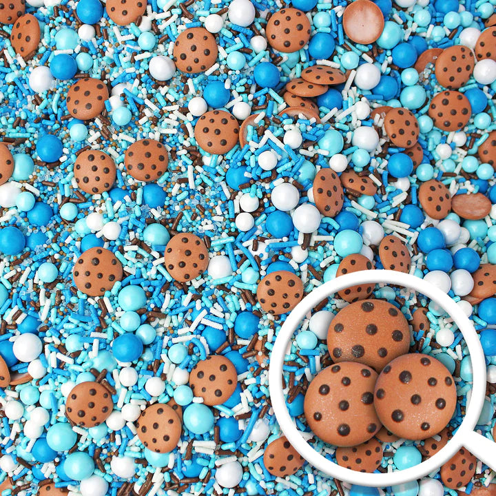 Our Cookies and Milk Sprinkle Mix is a sweet blend of blues and whites with pops of chocolate brown. Tiny hand-piped royal icing chocolate chip cookies complete this mix.