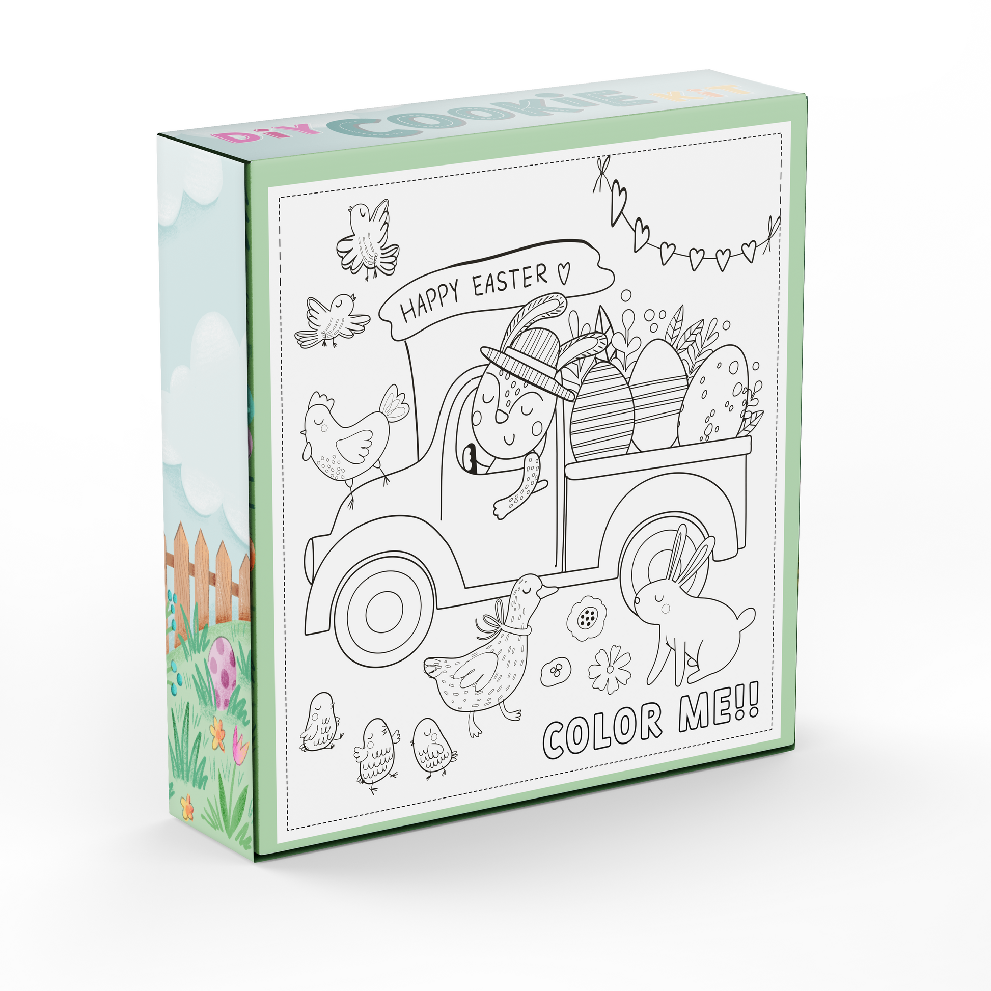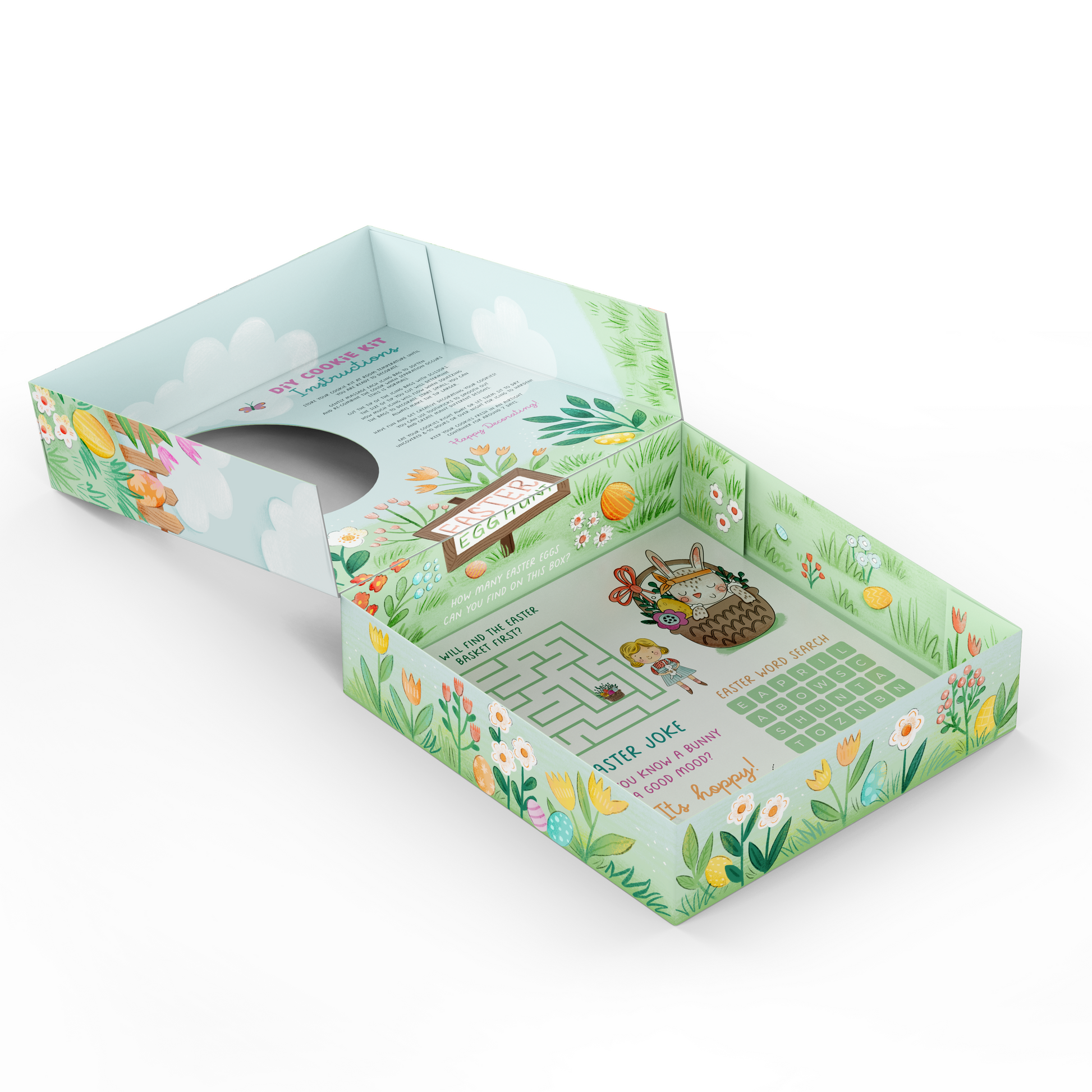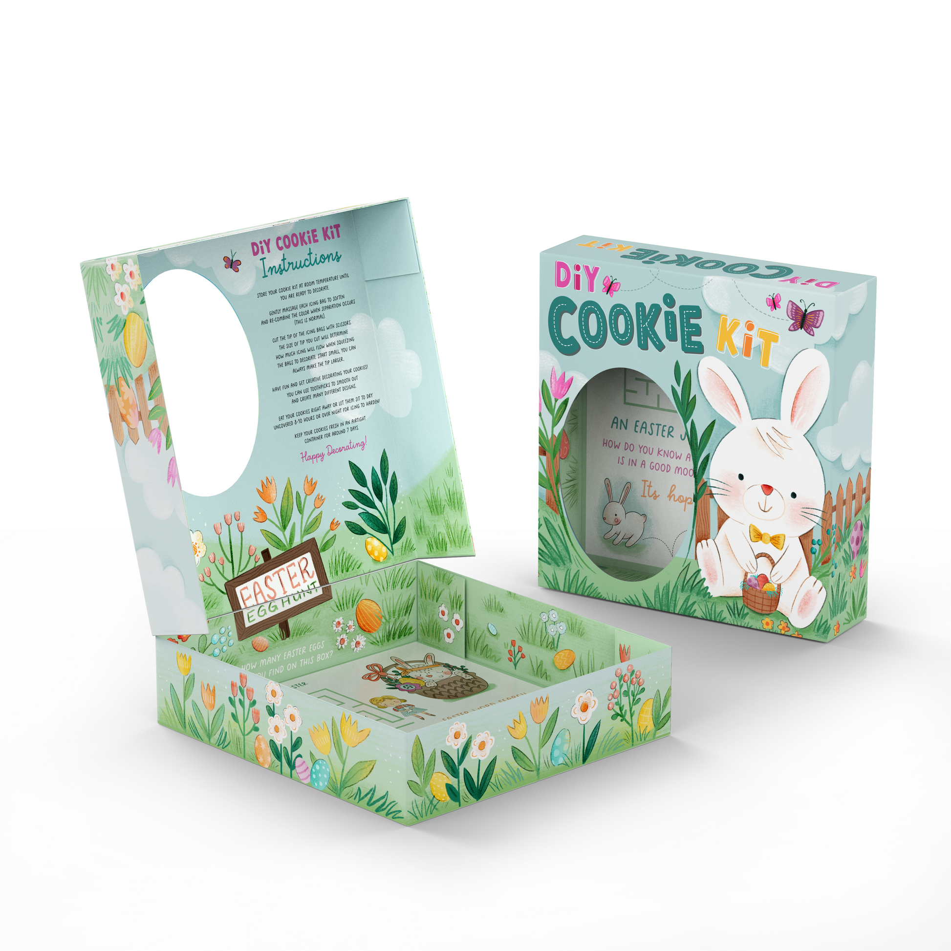 12" x 5" x 1.5" One piece Cookie Box with Window in "Bunnies & flowers " Pattern with coordinating "Hoppy Easter" message with pink interior.