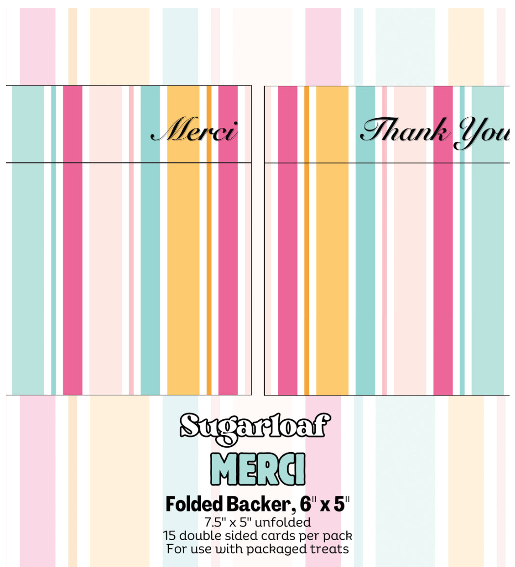 6" x 5" Folded Backer in "Striped" Pattern on both sides. "Merci" on one side and "Thank you" on opposite side. This beautiful folded backer would work for weddings, teachers, or anytime you want to show appreciation!