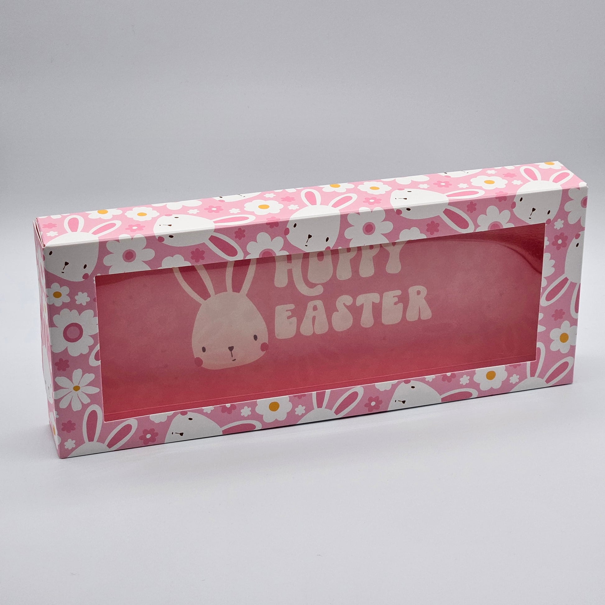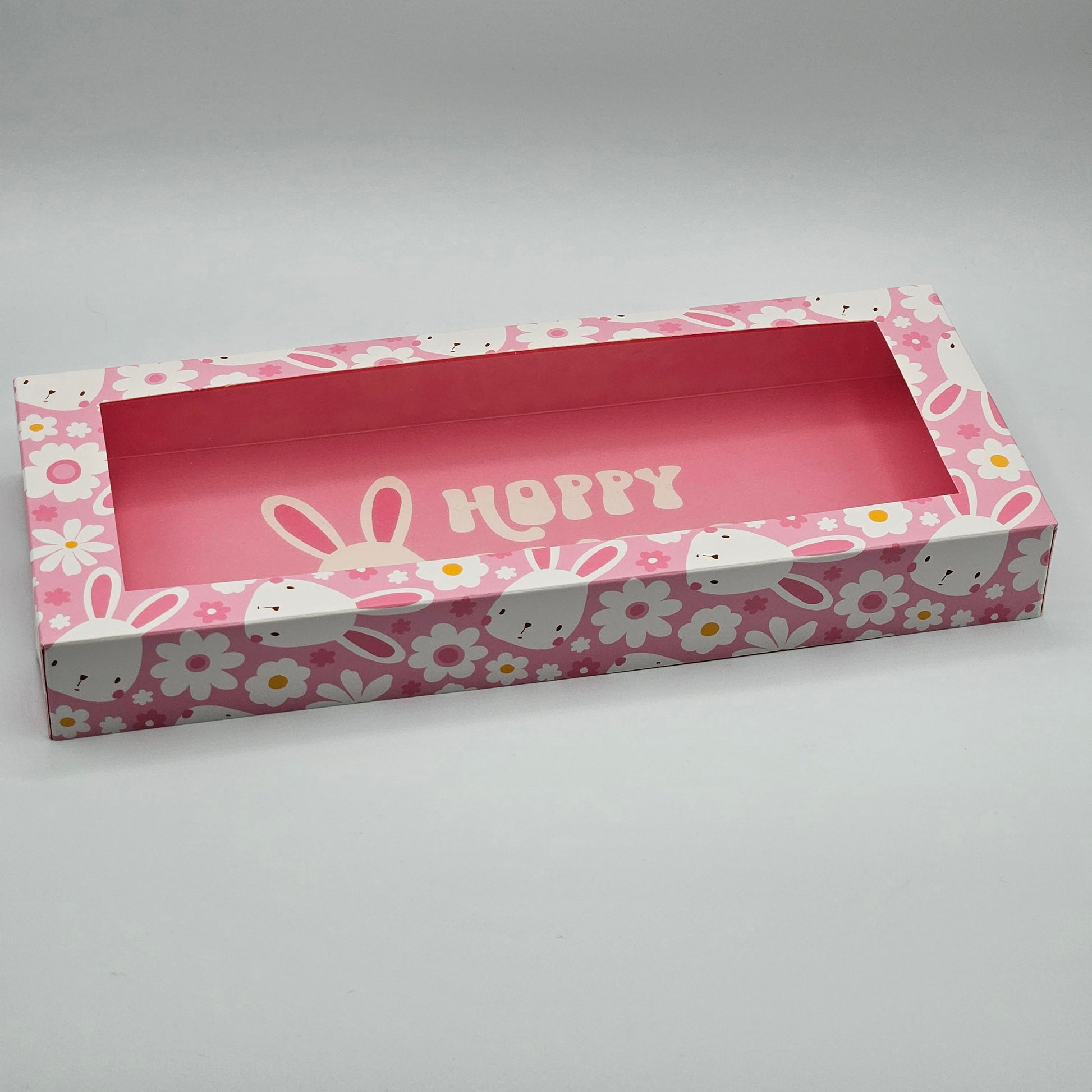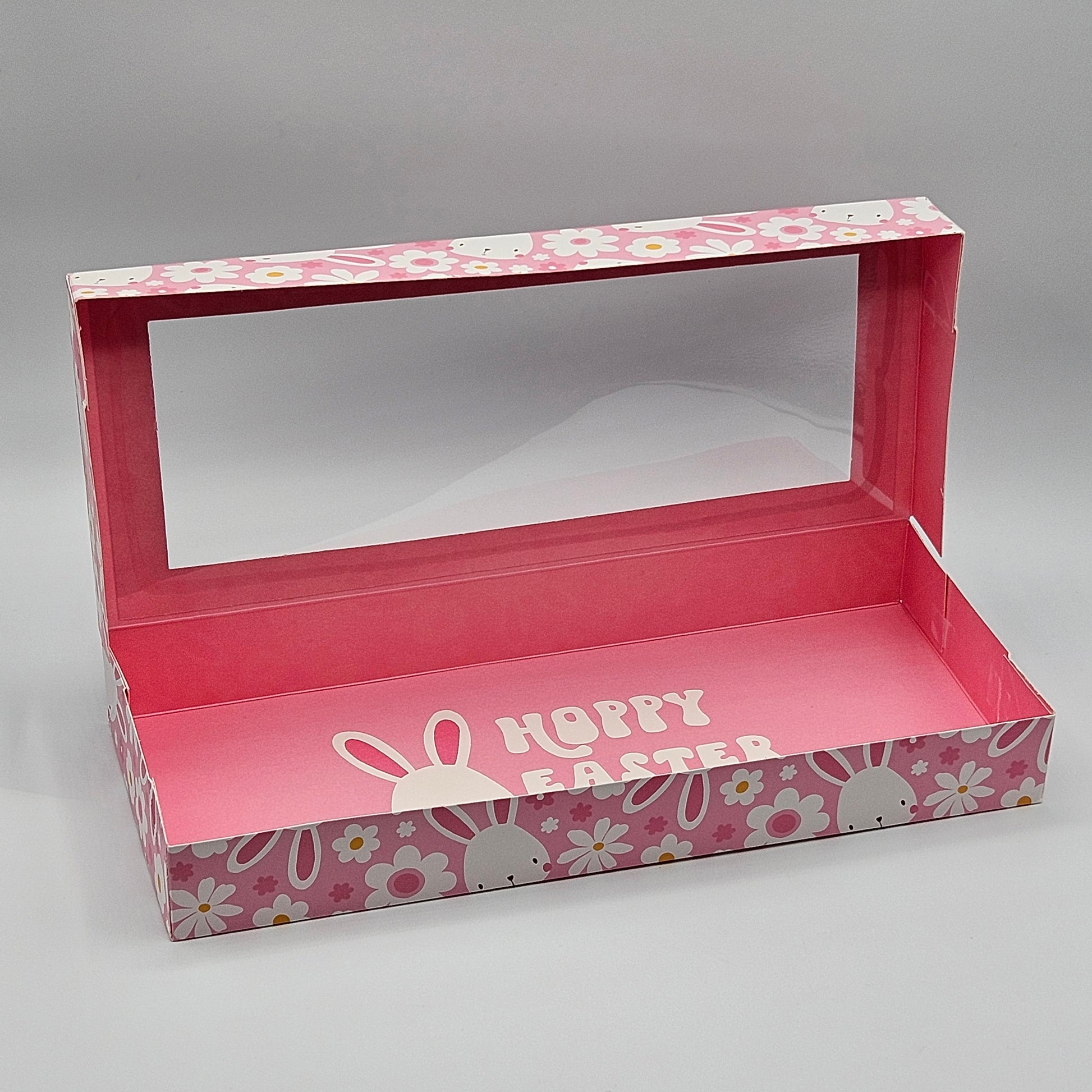 12" x 5" x 1.5" One piece Cookie Box with Window in "Bunnies & flowers " Pattern with coordinating "Hoppy Easter" message with pink interior.