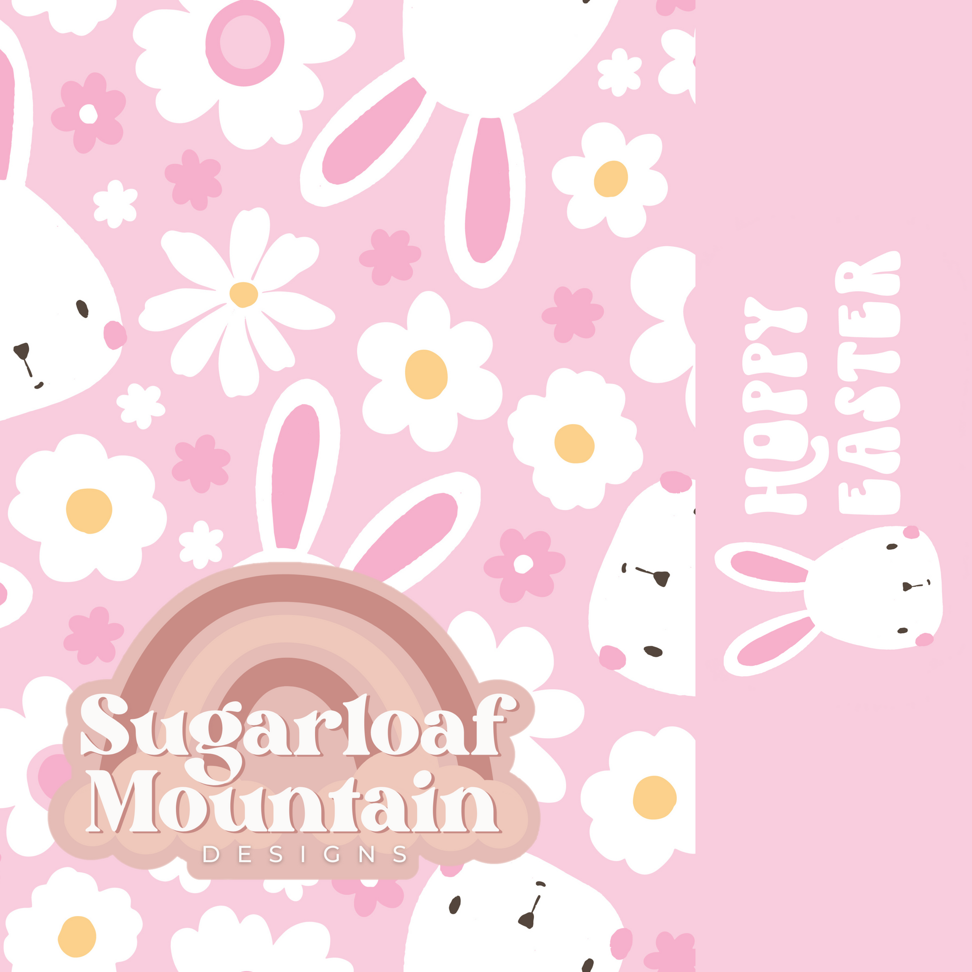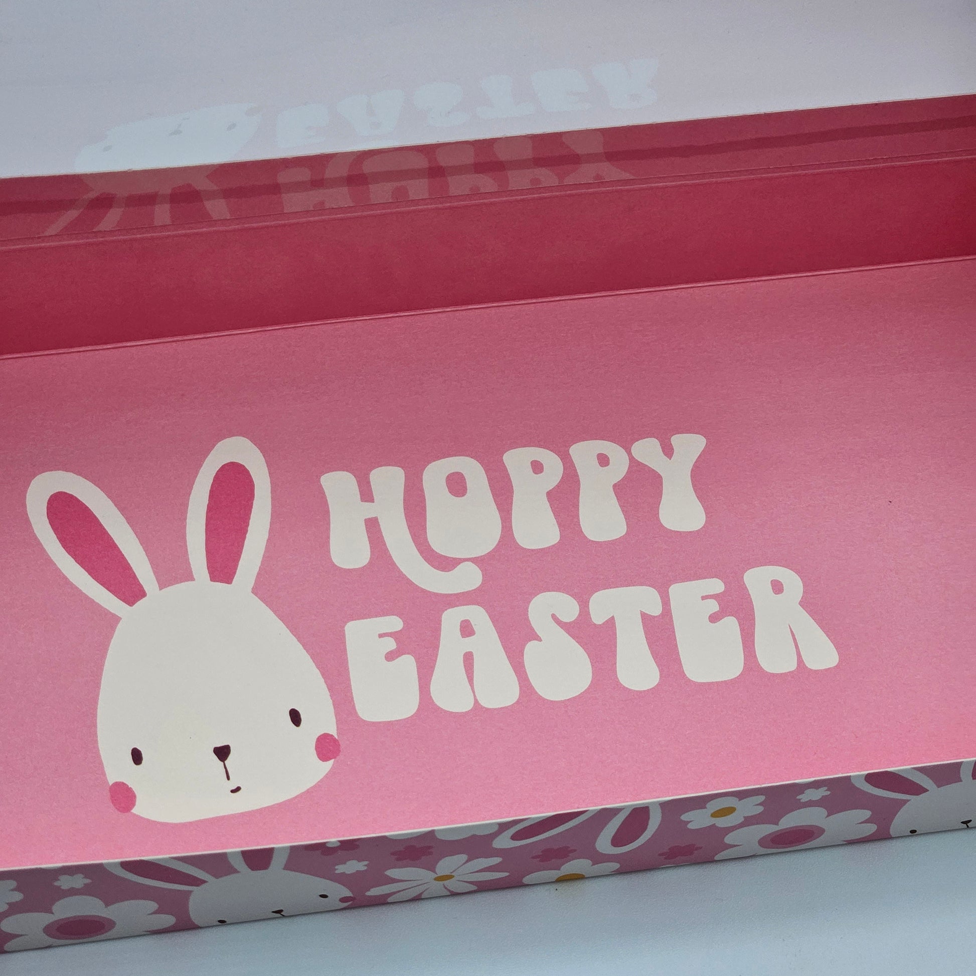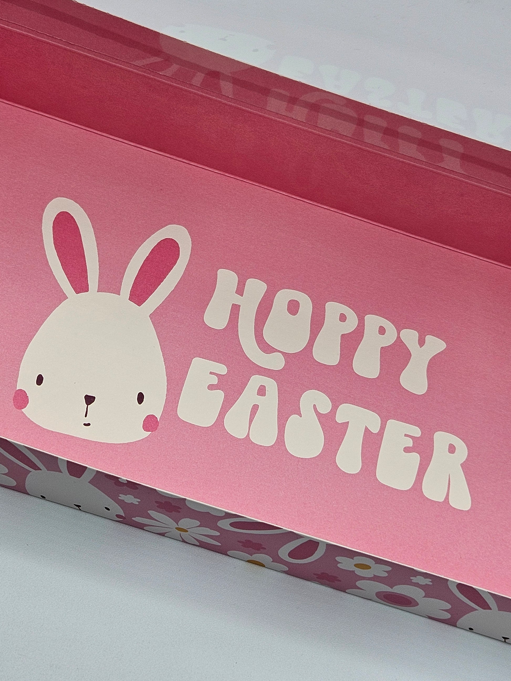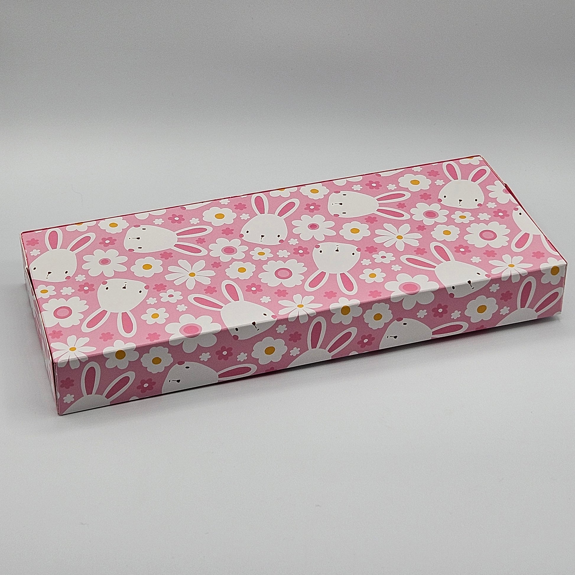 12" x 5" x 1.5" One piece Cookie Box with Window in "Bunnies & flowers " Pattern with coordinating "Hoppy Easter" message with pink interior.