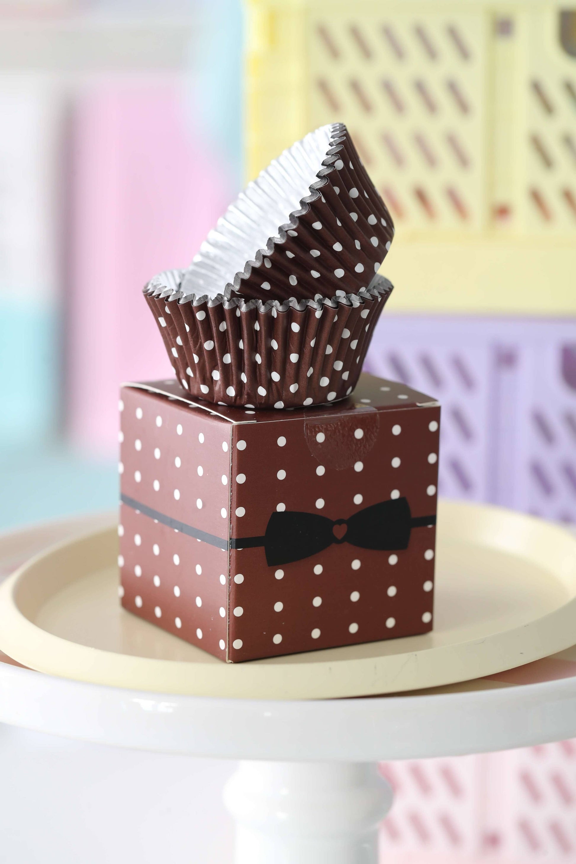 Set of 50 foil-lined cupcake liners comes in a cute brown box