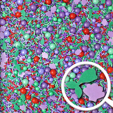 Our Mermaid Princess Sprinkle Mix is sure to leave your speechless! It features a stunning jewel-toned blend of teals, greens, purples with pops of bright red!