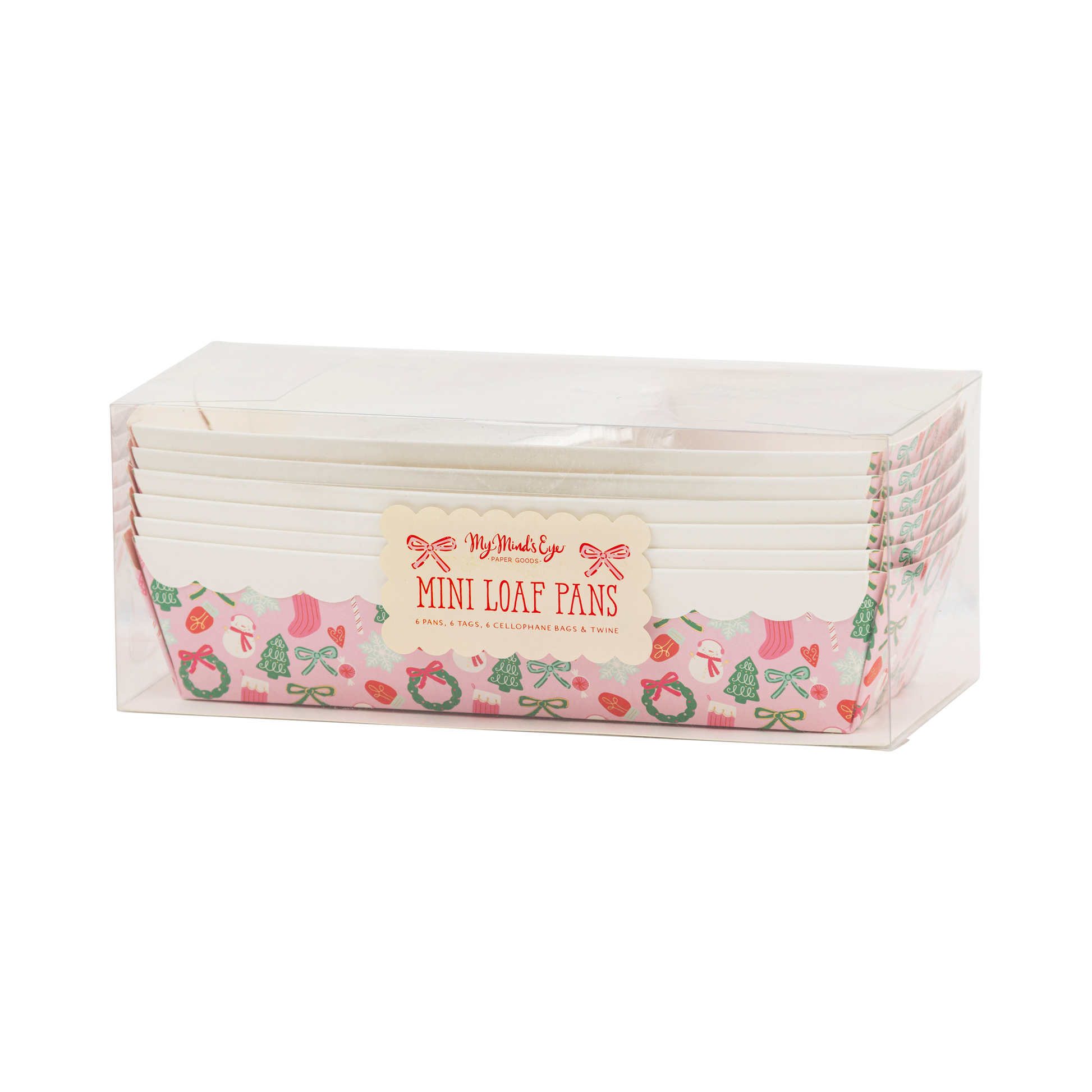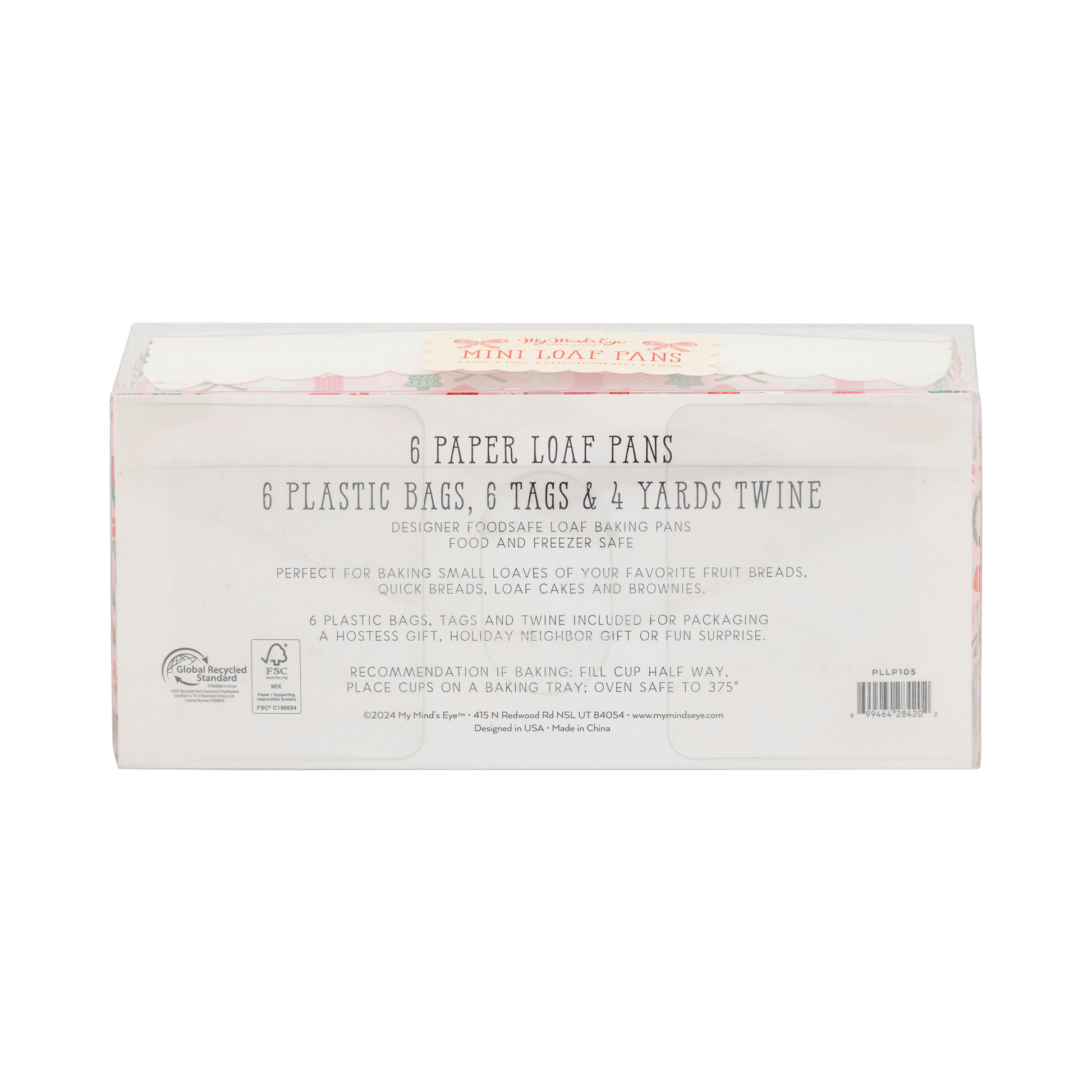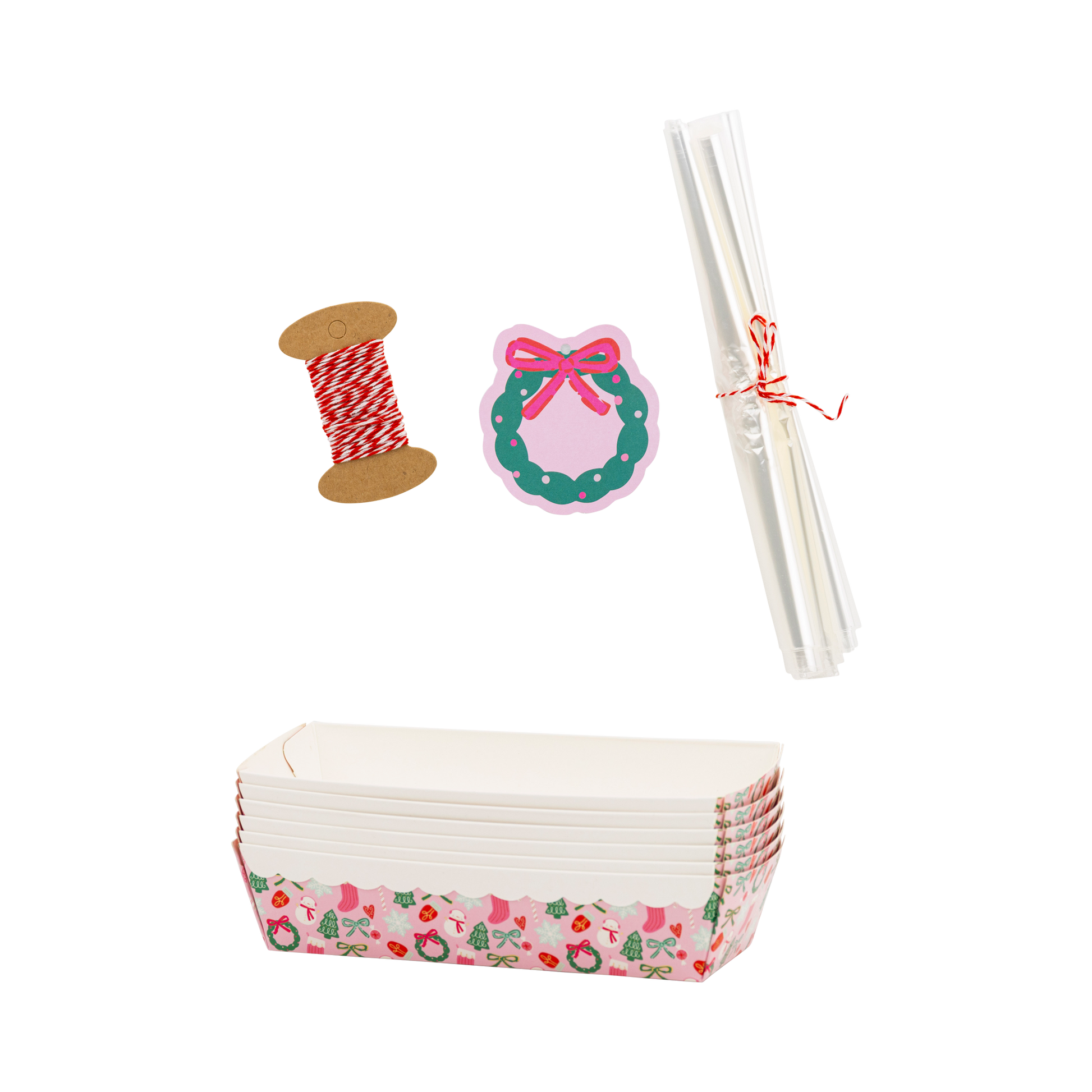 Bake up some holiday cheer with our Loaf Pan Set! These foil pans feature festive Christmas icons, making them perfect for all your holiday baking needs. Get ready to spread some joy (and cookies) with this cute set. * Six 7.5" x 3.25" x 2" paper loaf pans * 6 Designer tags * 6 Cellophane bags * 4 yards of baker's twine * gold foil