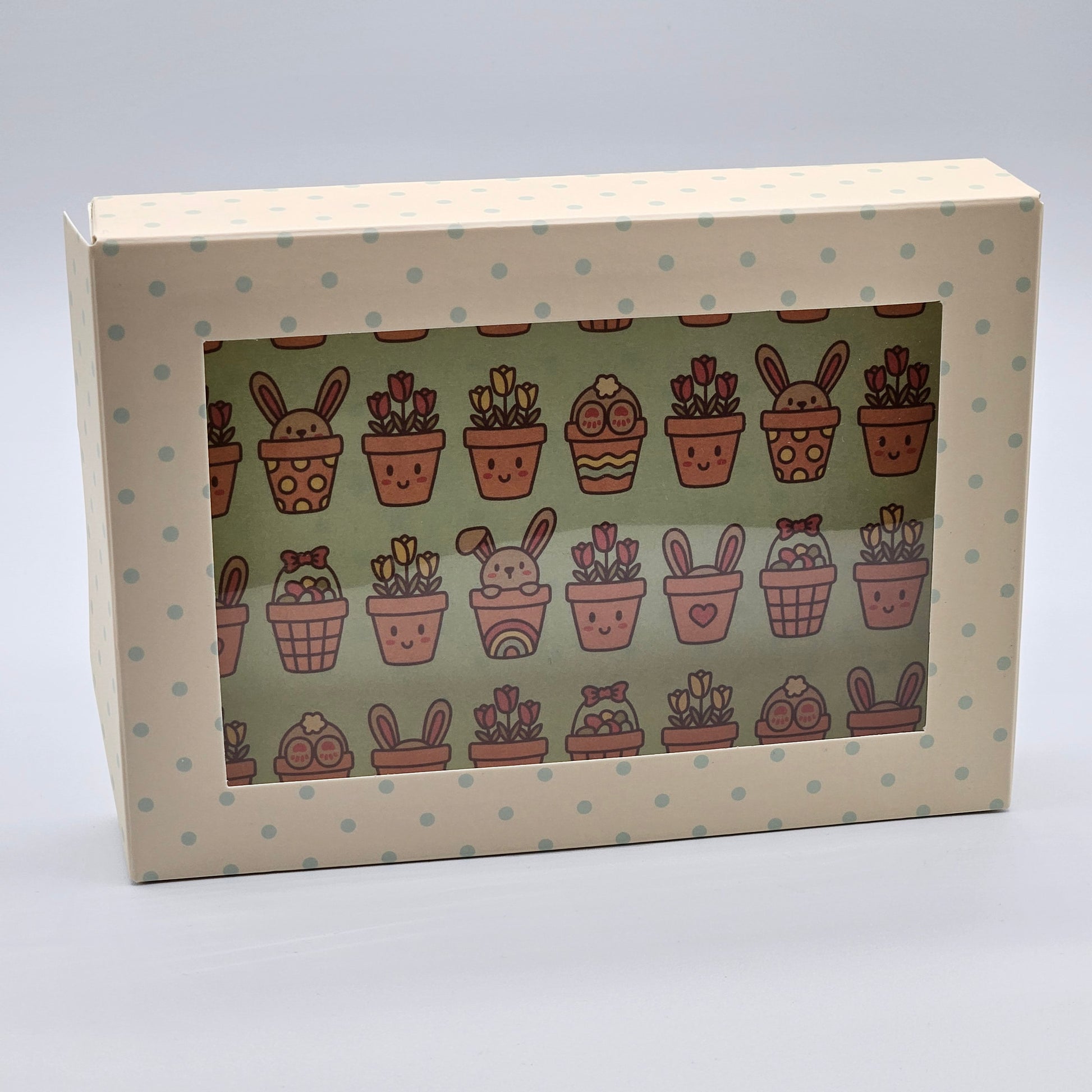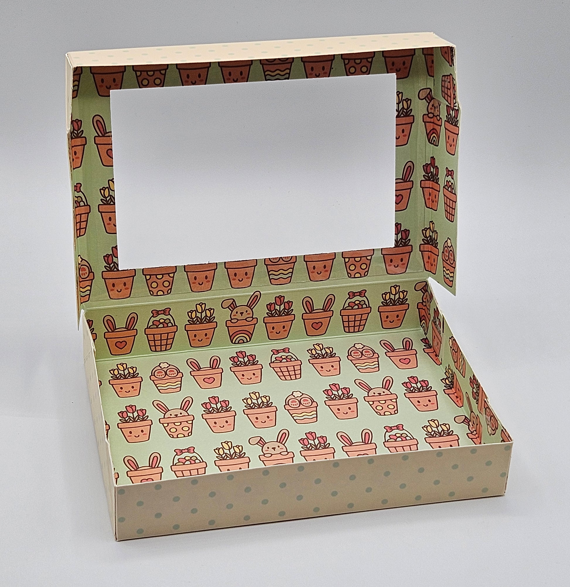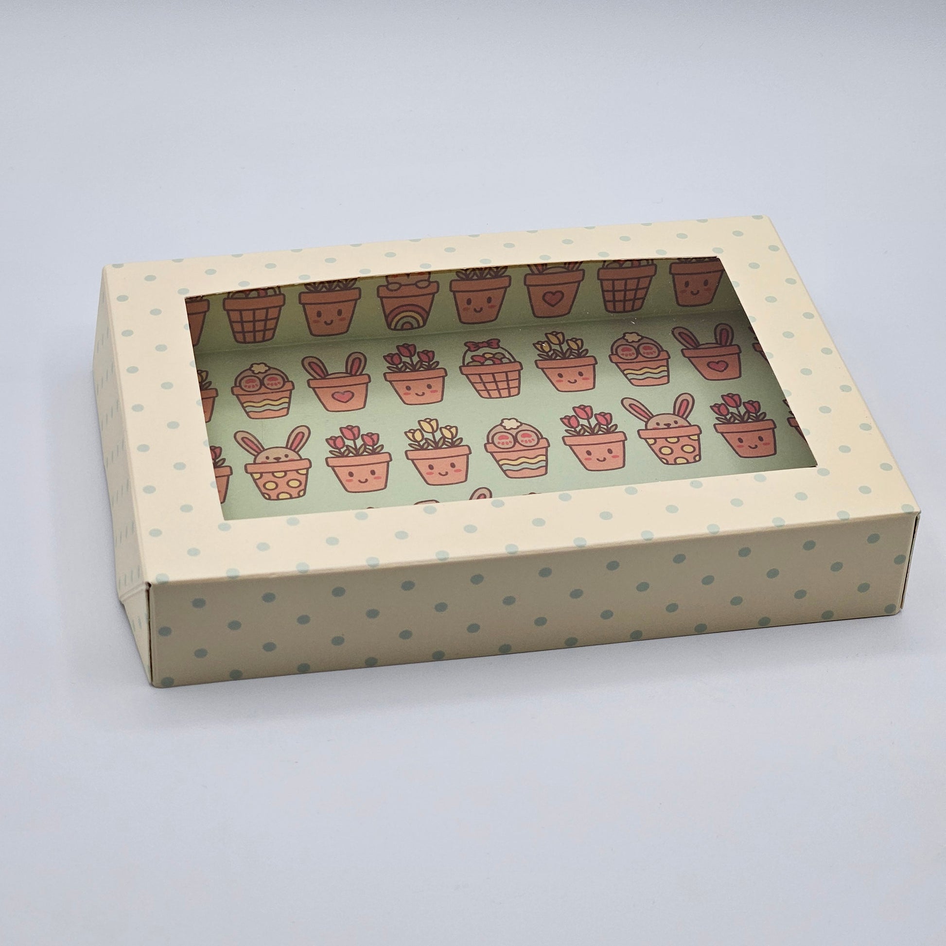 7" x 5" x 1.25" One piece Cookie Box with Window in "Yellow with Green Polka Dot" Pattern with coordinating "Potted Bunnies" interior.