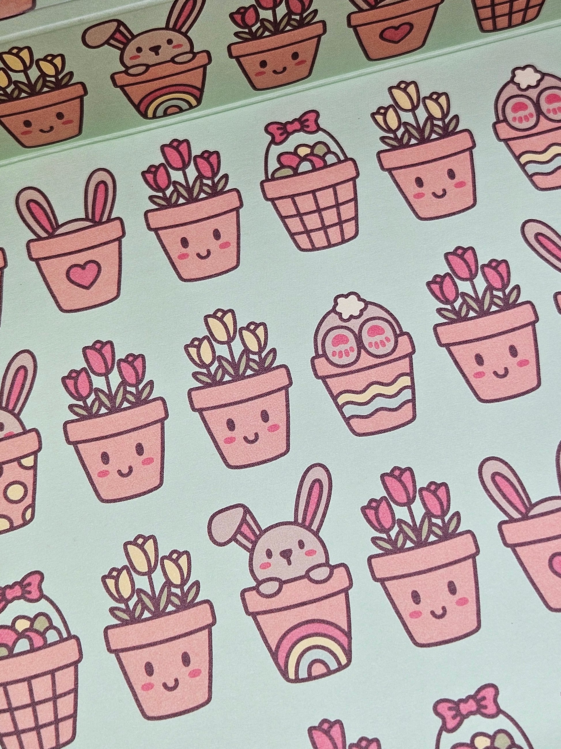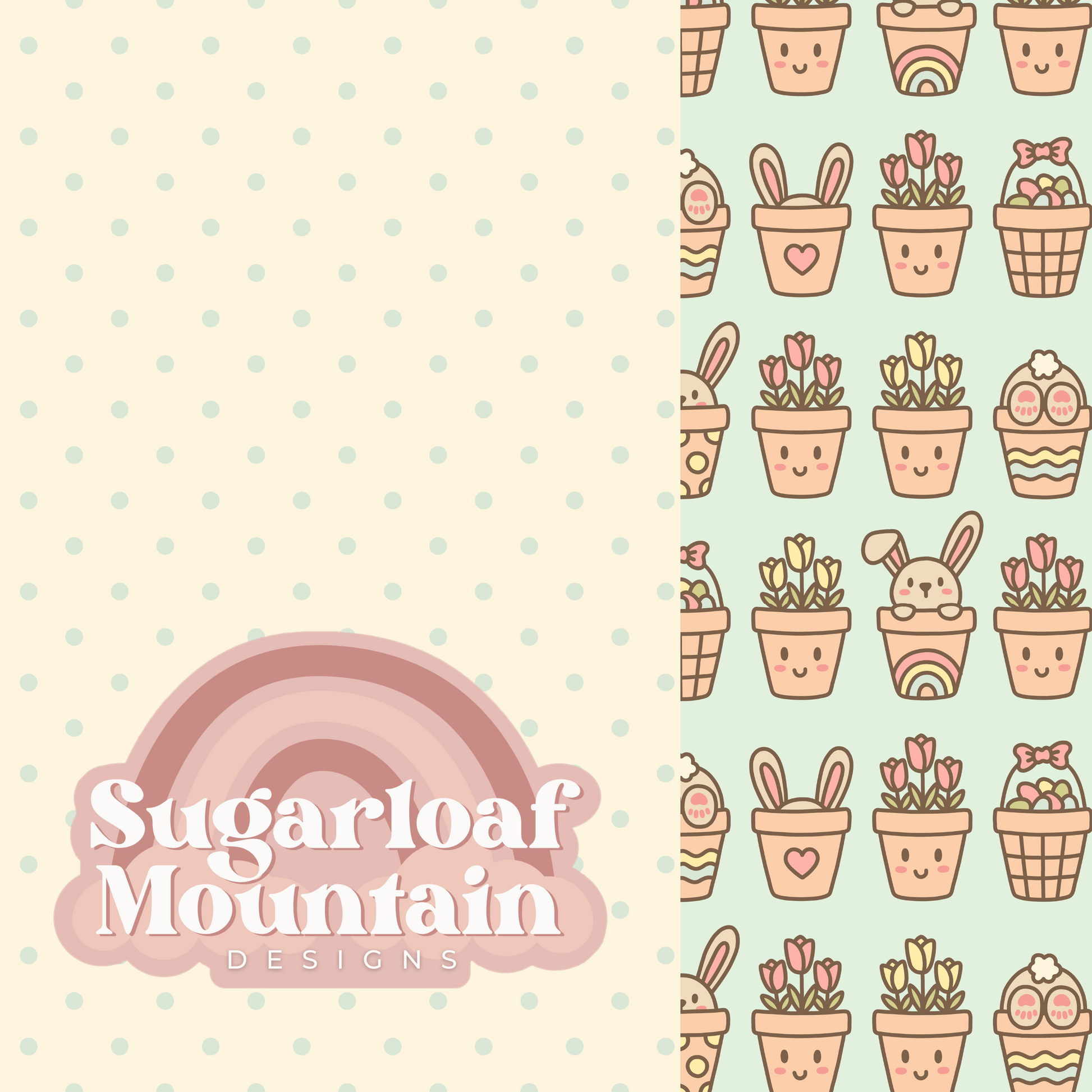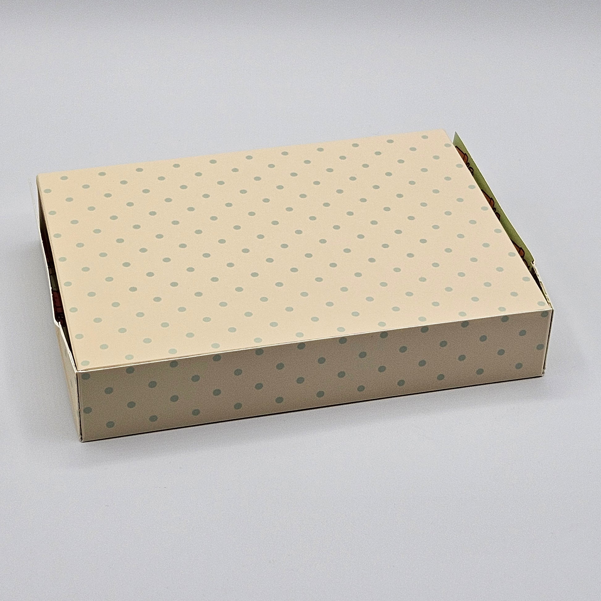 7" x 5" x 1.25" One piece Cookie Box with Window in "Yellow with Green Polka Dot" Pattern with coordinating "Potted Bunnies" interior.