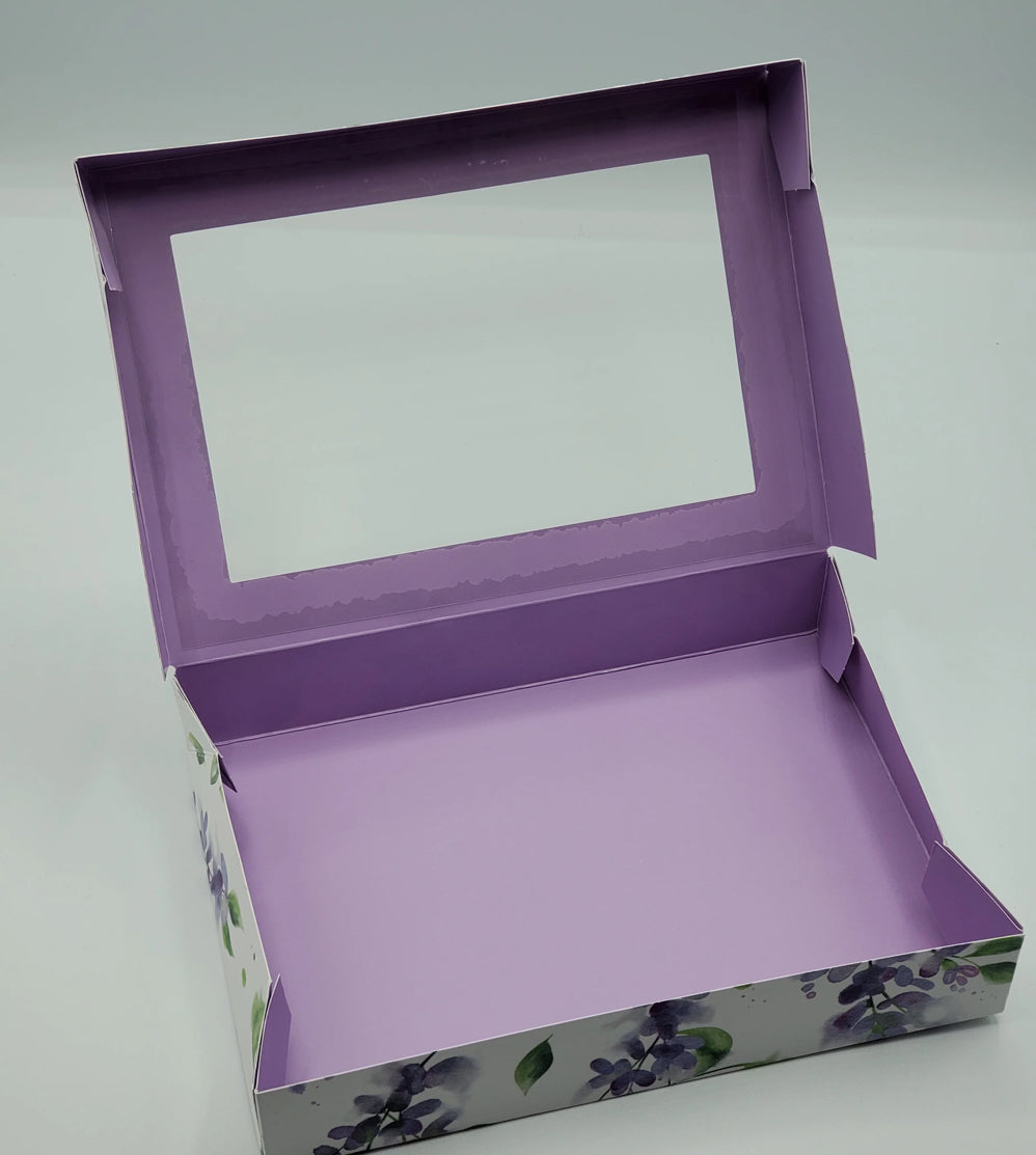 7" x 5" x 1.25" One piece Cookie Box with Window in "Lilac" Pattern with Lilac colored interior. This box is meant to hold 2 regular sized Decorated Cookies.