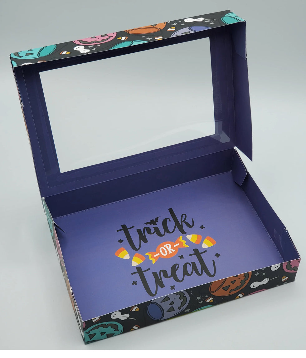 7" x 5" x 1.25" One piece Cookie Box with Window in "PUMPKIN PAILS " Pattern with coordinating purple & Trick or Treat wording interior.