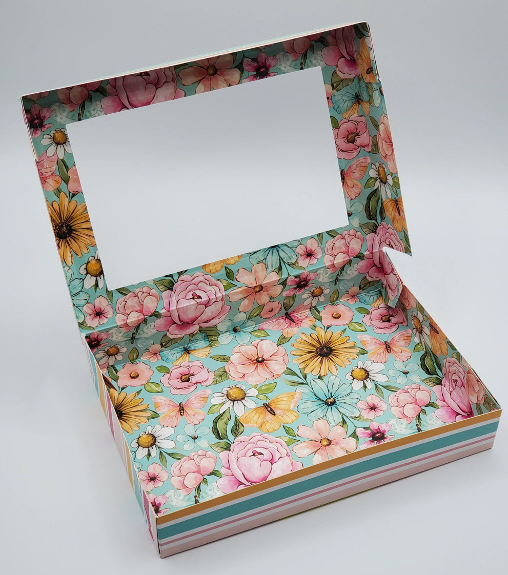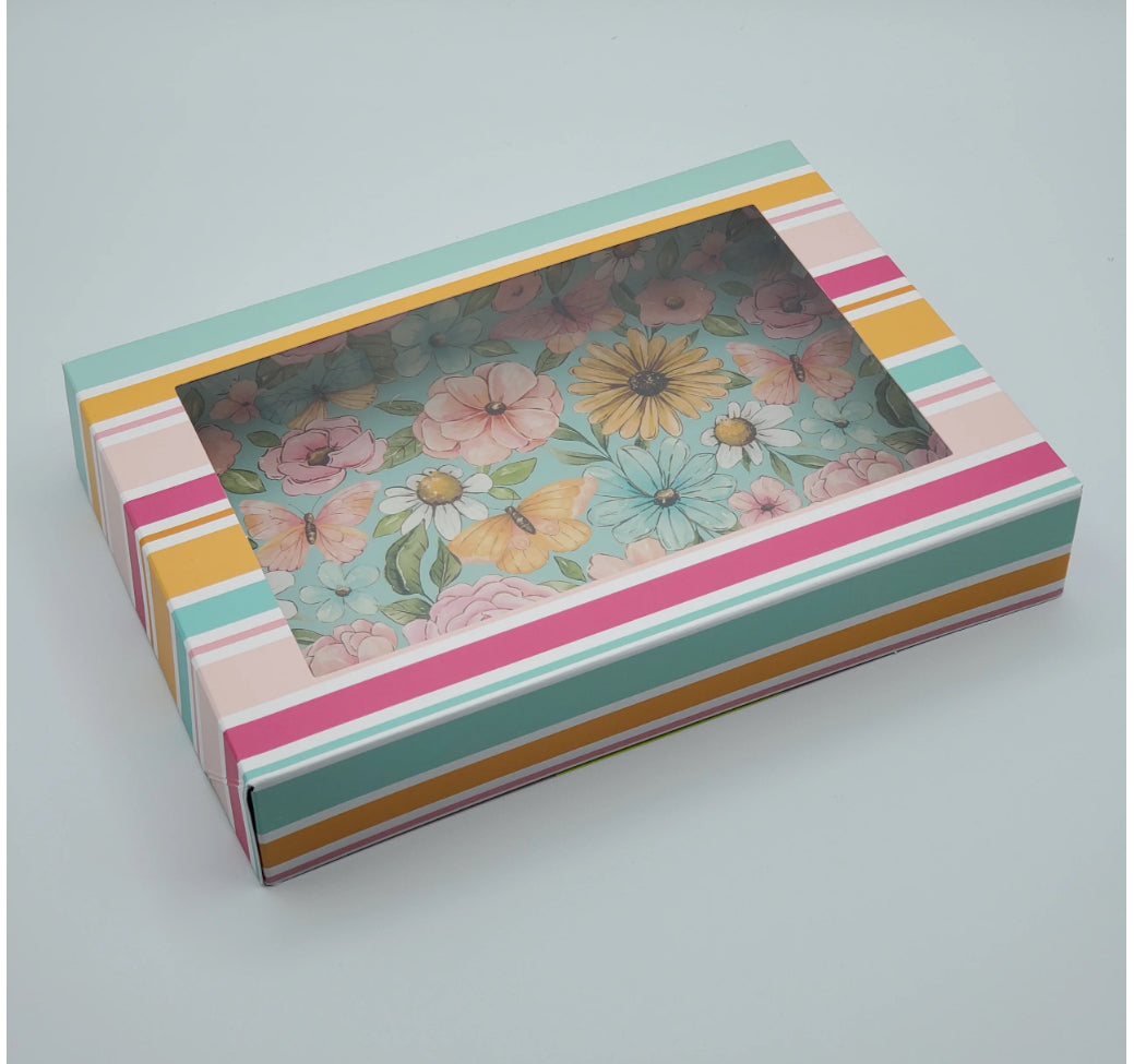 7" x 5" x 1.25" One piece Cookie Box with Window in Summer Stripes Pattern with coordinating floral interior.