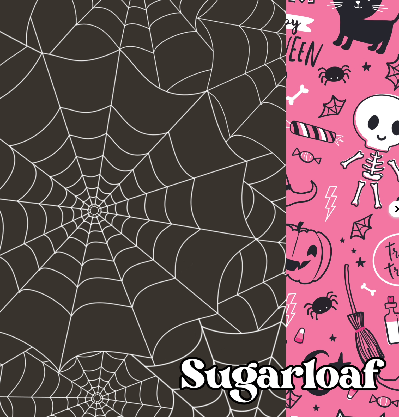 8" x 5" x 1.25" One piece Cookie Box with Window in "Spider Web" Pattern with coordinating "Pink Halloween Doodle" interior.