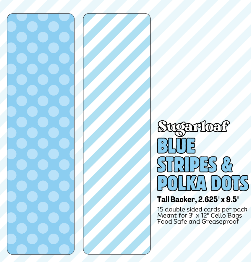 9.5" x 2.625" Tall Backers for Cookies or other small treats in "Blue Stripes" Pattern with matching "Polka Dots" on the opposite side.