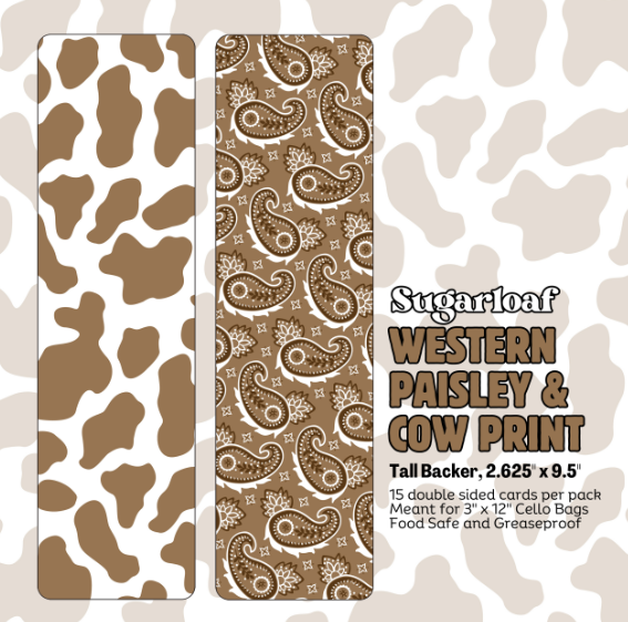 9.5" x 2.625" Tall Backers for Cookies or other small treats in "Cow Print" Pattern with matching "Western Paisley" on the opposite side.