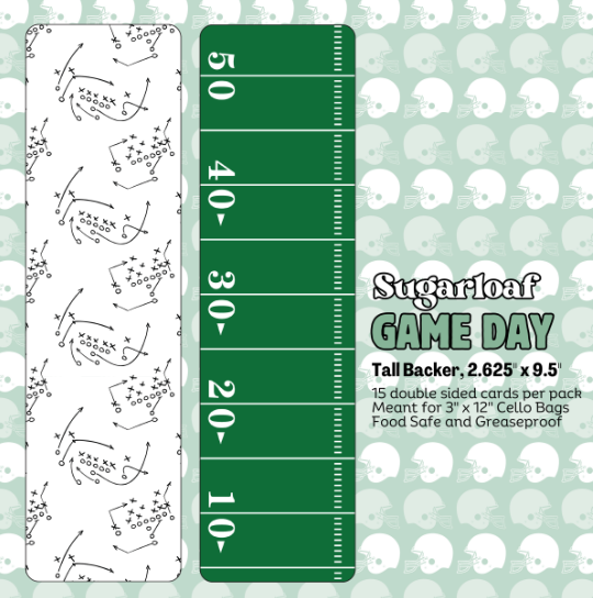 9.5" x 2.625" Tall Backers for Cookies or other small treats in "Football Play" Pattern with matching "Football Field" on the opposite side.